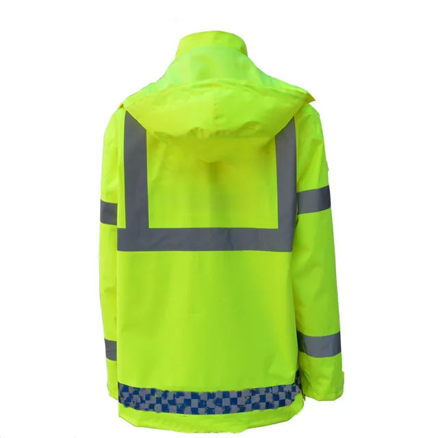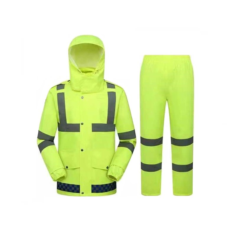 Αδιάβροχη φόρμα με κουκούλα, One Sized, σε κίτρινο φωσφοριζέ χρώμα με ανακλαστικές λωρίδες στο επάνω και κάτω μέρος.