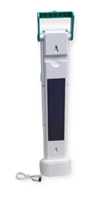 Επαναφορτιζόμενο φως LED έκτακτης ανάγκης με ηλιακό πάνελ στο πίσω μέρος για έξτρα αυτονομία. Χαρακτηριστικά: 3 επίπεδα φωτισμού. Θερμό και ψυχρό φως. Φορτίζει μέσω USB (περιλαμβάνεται) ή μέσω του ηλιακό πάνελ που διαθέτει, Χωρητικότητα μπαταρίας: 2600mAh, Διάρκεια ηλιακής φόρτισης: 8-12 ώρες σε ηλιοφάνεια, Διάρκεια λειτουργίας: έως 10 ώρες, ανάλογα με την ένταση φωτισμού, Πτυσσόμενη χειρολαβή μεταφοράς, Διαστάσεις: 43 x 9 cm. Μπορεί να τοποθετηθεί επιδαπέδια ή επιτοίχια χάρη στις ειδικές εσοχές που διαθέτει. Περιλαμβάνει: Καλώδιο φόρτισης USB, Βάση στήριξης.