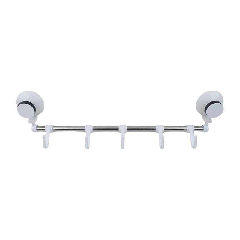 Κρεμάστρα πετσέτας μπάνιου με άγκιστρα κρεμάσματος ρυθμιζόμενης θέσης, με μεταλλική ράγα inox και πλαστικές βάσεις υψηλής ανθεκτικότητας. Εύκολη τοποθέτηση με ισχυρές βεντούζες, χωρίς να απαιτείται βίδωμα.