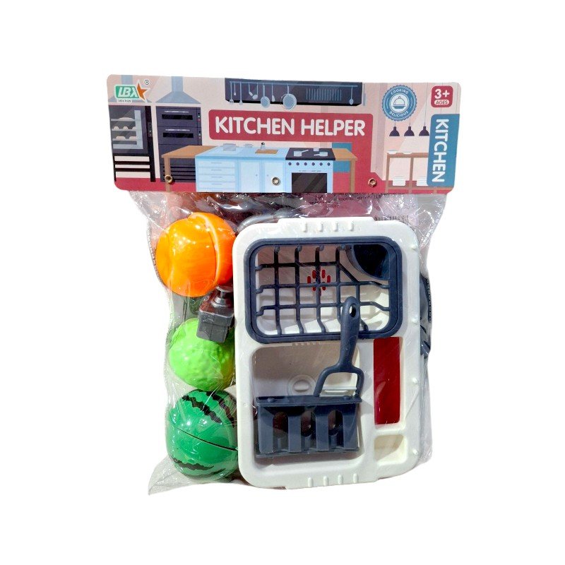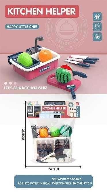 Παιχνίδι νεροχύτης κουζίνας με αξεσουάρ σκεύη και τρόφιμα, σε υπέροχο πολύχρωμο σχεδιασμό.