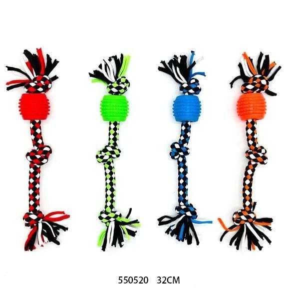 Παιχνίδι σκύλου σχοινί με μασητική μπάλα, από ελαστικό, ανθεκτικό, μη τοξικό πολυεστέρα, ιδανικό για παιχνίδια τραβήγματος/αντίστασης ενώ παράλληλα βοηθά στην υγιεινή στόματος του σκύλου σας καθώς καθαρίζει ήπια και απασχολεί τα δόντια του. Συνολικό μήκος: 32cm.