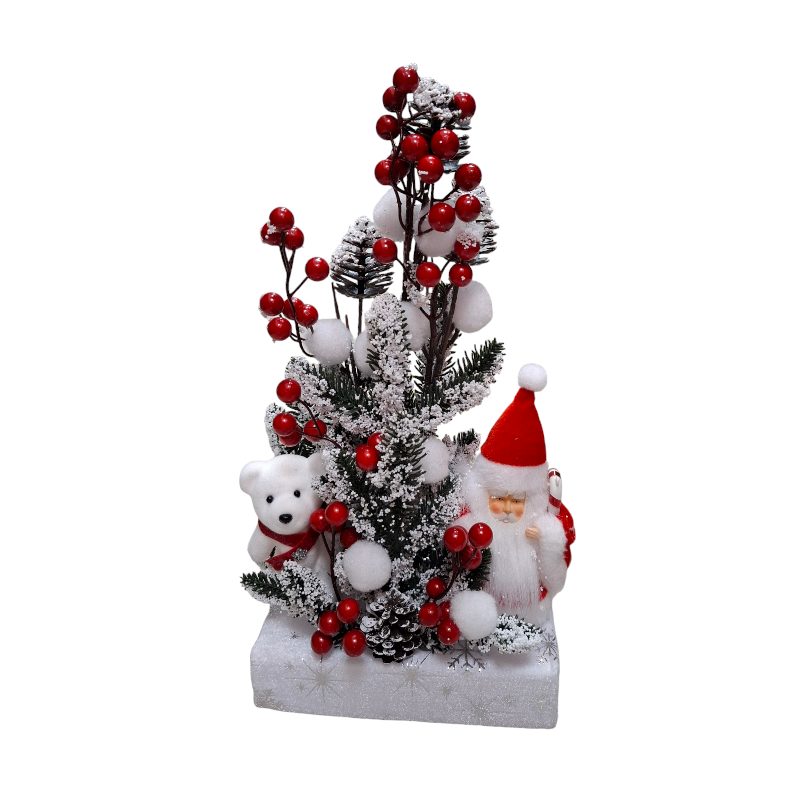 Χριστουγεννιάτικο διακοσμητικό με επιτραπέζια βάση και εντυπωσιακή σύνθεση με φιγούρα Άγιου Βασίλη, ποικιλία στολιδιών και υπέροχες λεπτομέρειες. Διαστάσεις: 35*20cm.